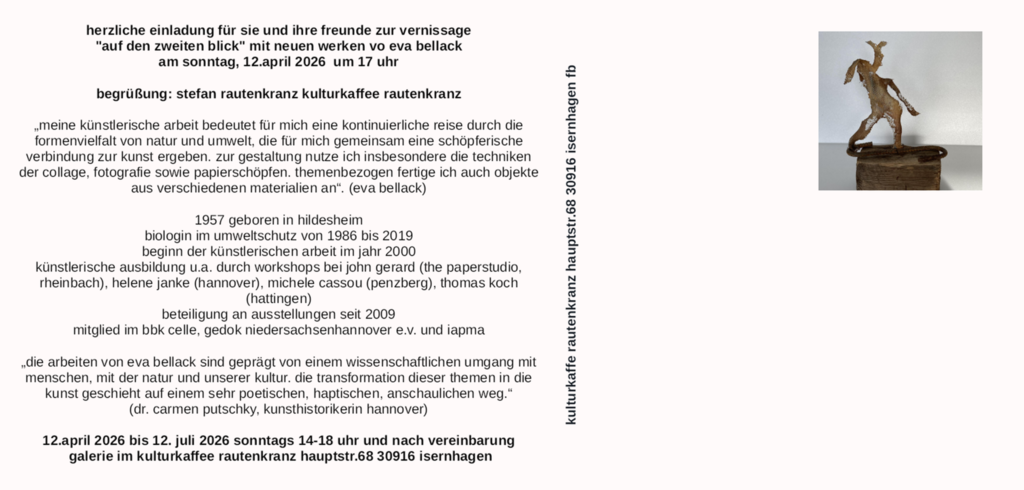 Das KulturKaffee Rautenkranz lädt am Sonntag 12. April 2026 um 17 Uhr zur Vernissage mit Arbeiten von Eva Bellack.